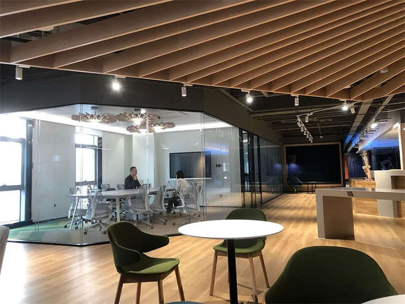 材料運(yùn)用上,采用一系列天然、可再生和低排放的節(jié)能措施和材料,讓員工感受到與自然的聯(lián)系,同時(shí)提供了室內(nèi)聲學(xué)舒適度。還采用了公司貿(mào)易產(chǎn)品——玻璃,各種玻璃的運(yùn)用,充分體現(xiàn)了企業(yè)性質(zhì)及對(duì)玻璃加工工藝的理解,既作為裝飾材料,也讓辦公區(qū)各個(gè)區(qū)域都成了產(chǎn)品展示區(qū),電梯廳和門廳運(yùn)用了黑色背烤漆蒙砂玻璃,電梯廳頂部運(yùn)用黑色銀鏡腐蝕雕刻形成總部辦公地所在的區(qū)域地圖,其他區(qū)域也充分將壓花玻璃、幕墻玻璃、淋浴隔斷玻璃及辦公高隔玻璃等進(jìn)行了充分展示。