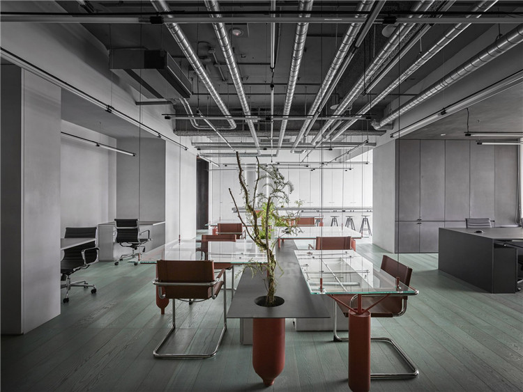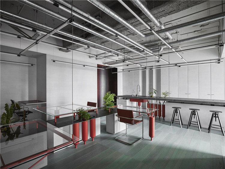 當靈感關鍵抓緊"科學"而非"辦公室",設計師希望強化產(chǎn)業(yè)屬性里的科學基底,扭轉(zhuǎn)一般人對辦公室的刻板藍圖.回歸產(chǎn)品本身最貼近的實驗室、工廠環(huán)境,日日可見的試管、生鐵黑鐵、氣體輸送管,以及包裝承載科技氣體的獨特鋼瓶,擷取生產(chǎn)鏈上再熟悉不過的材質(zhì)與造型,拆解轉(zhuǎn)換成辦公空間的結構形體.