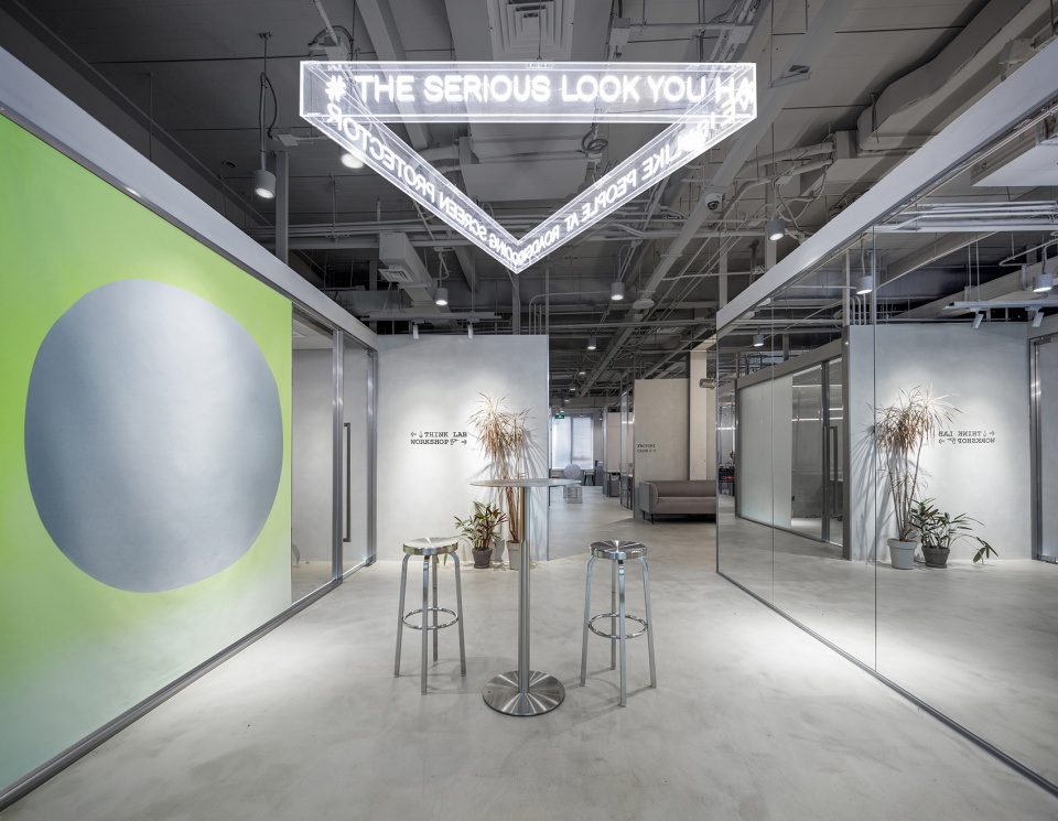 空間有兩個入口,主入口保證通行和展示,次入口則作為一個工廠的精神象征。設計師采用工廠車間金屬推拉門和防撞門作為工廠的大門,將粗獷銳利的工業感發揮到極致。前廳四壁貼有銀箔,作為對電影《Factory Girl》的致敬。