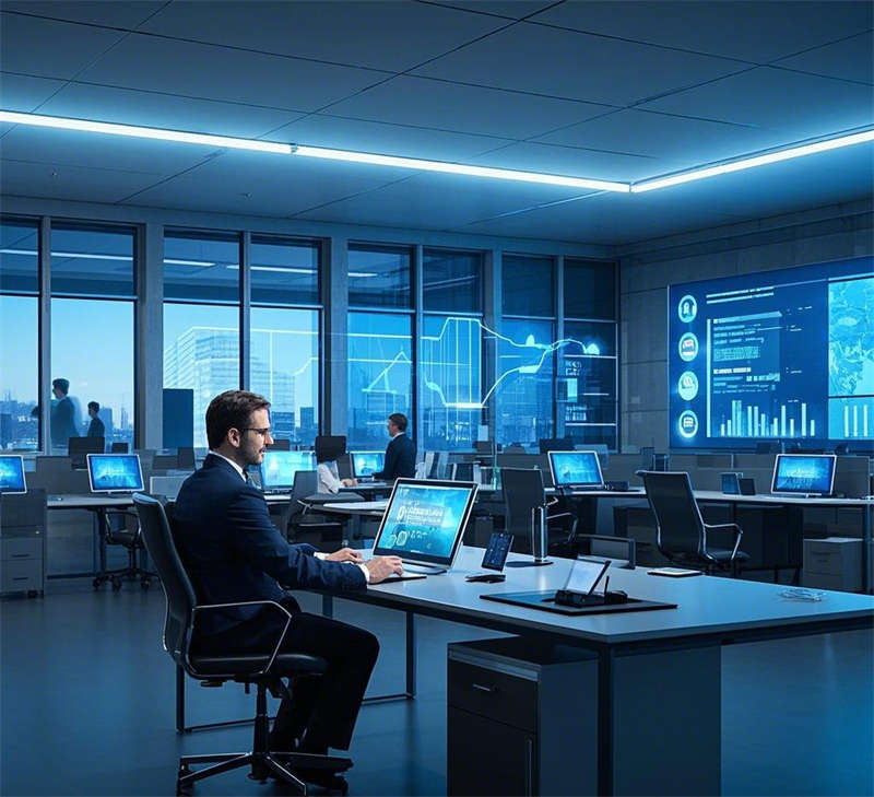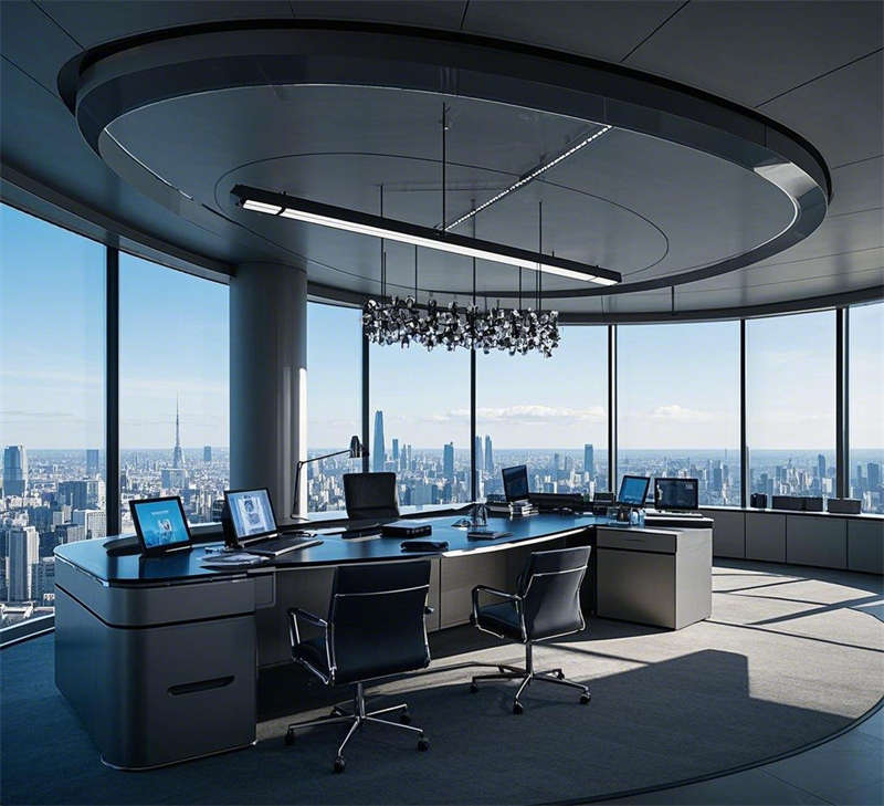 前臺接待室以懸浮式前臺和全息投影動態logo為核心,金屬質感墻面與燈光效果結合,營造出未來之門的第一印象。敞開式辦公室通過數據流全息屏幕和智能辦公桌,打造高效協作的數字化辦公環境。經理辦公室采用全景落地窗和智能辦公系統,簡約大氣,兼顧商務與舒適。總裁辦公室位于頂層,全景視野與奢華材質相得益彰,藝術裝置彰顯領導風范。