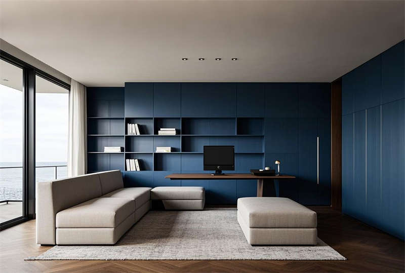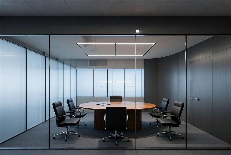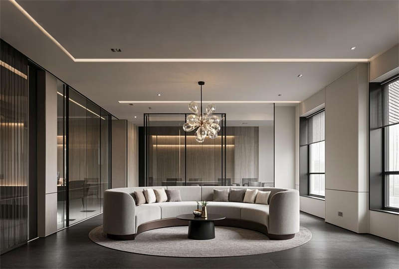 本方案采用現(xiàn)代簡(jiǎn)約設(shè)計(jì)語(yǔ)言,整體空間以淺灰、白、原木三色為主基調(diào)。前臺(tái)區(qū)設(shè)置懸浮式接待臺(tái)與發(fā)光LOGO墻,搭配LED線(xiàn)性照明塑造企業(yè)形象。開(kāi)放式辦公區(qū)采用模塊化工位布局,通過(guò)玻璃隔斷劃分功能區(qū)域,保證自然采光最大化的同時(shí)提升空間通透感。智能會(huì)議系統(tǒng)集成于各會(huì)議室,配備電動(dòng)投影和書(shū)寫(xiě)玻璃墻。經(jīng)理室采用深藍(lán)色烤漆木飾面提升商務(wù)質(zhì)感,休息區(qū)設(shè)置咖啡吧與卡座強(qiáng)化員工關(guān)懷。走廊運(yùn)用導(dǎo)視燈帶串聯(lián)各區(qū)域,茶水間六角地磚增添趣味性。培訓(xùn)室階梯式布局配合吸音墻面確保聲學(xué)效果,電話(huà)間磨砂玻璃立方體兼顧隱私與采光。VIP室智能霧化玻璃實(shí)現(xiàn)空間靈活轉(zhuǎn)換,整體設(shè)計(jì)注重功能分區(qū)與人文關(guān)懷的平衡。