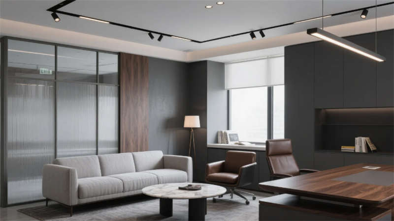 高管辦公區(qū)通過灰玻與豎向木紋鋁材構(gòu)筑半私密空間,L型胡桃木辦公桌與深棕真皮座椅彰顯商務(wù)質(zhì)感,獨(dú)立閱讀角的落地?zé)魻I(yíng)造人文氛圍。總裁辦公室運(yùn)用懸浮式書架墻與黑檀木辦公桌塑造權(quán)威感,環(huán)形皮革沙發(fā)組與天然大理石茶幾構(gòu)成高端會(huì)客場(chǎng)景,日式茶室通過木格柵與洞石墻面實(shí)現(xiàn)東西方美學(xué)交融。