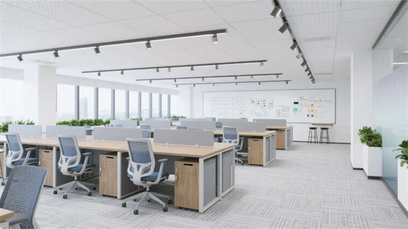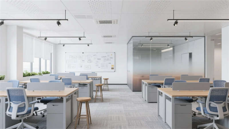 企業(yè)大堂延續(xù)外立面色系,雪花白大理石地面與深灰導(dǎo)視帶構(gòu)建空間骨架,曲面木紋石背景墻通過背光企業(yè)標(biāo)識(shí)形成視覺焦點(diǎn),漸變鋁方通吊頂?shù)木€性光帶引導(dǎo)人流走向。開放式辦公區(qū)以灰橡木辦公模塊為核心,沖孔鋁板吊頂整合軌道射燈系統(tǒng),漸變霧化玻璃隔斷內(nèi)置綠植槽,編織紋地毯有效降低行走噪音。