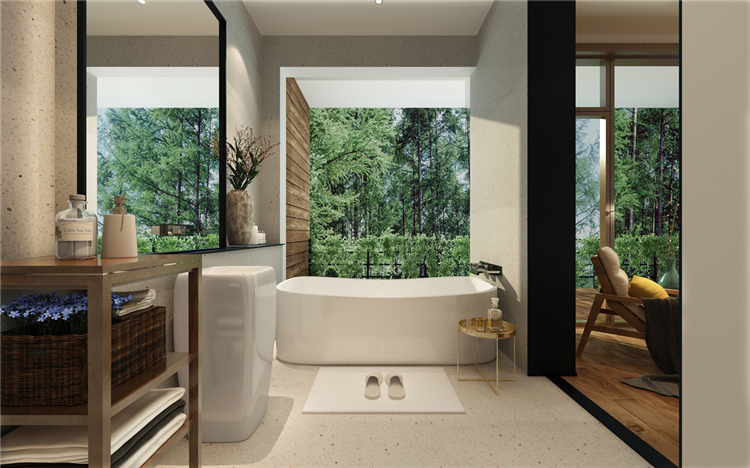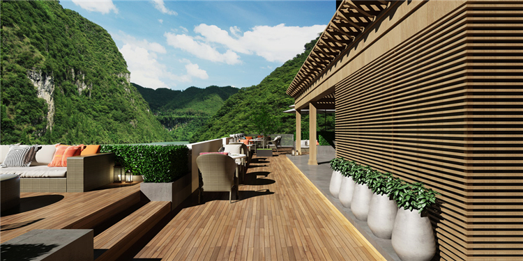 本案度假酒店設(shè)計依山傍水,設(shè)計師在規(guī)劃時,充分考慮到自然環(huán)境帶給酒店的附加值。設(shè)計方案時,設(shè)計師就將部分功能區(qū)規(guī)劃到室外露天場地,當(dāng)然在室內(nèi)設(shè)計中也充分利用了自然采光的設(shè)計手法,讓整個度假酒店與自然環(huán)境融為一體。