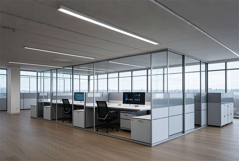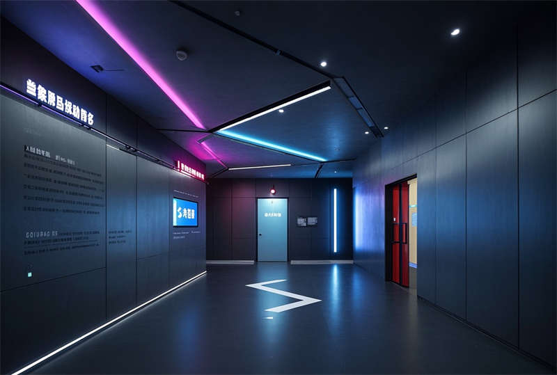 本案為 6000 平方米現代化科技辦公樓裝修項目,設計采用 ' 未來辦公生態 ' 理念,以藍灰主色調構建專業商務氛圍。空間規劃突破傳統格局,大堂設置 10 米挑空 LED 藝術裝置墻,智能光控系統實現晝夜模式切換。開放式辦公區采用模塊化組合家具,集成無線充電、智能升降等人性化功能。會議室配置可觸控霧化玻璃隔斷系統,實現空間靈活轉換。特別設計的階梯會議中心配備全景聲控系統,墻面采用吸音穿孔鋁板確保會議私密性。環保理念貫穿始終,選用零甲醛板材和可回收地毯,屋頂花園配置雨水收集系統。燈光設計采用色溫可調 LED 光源,通過智能中控系統實現場景模式一鍵切換,打造高效、舒適、可持續發展的新型辦公生態圈。