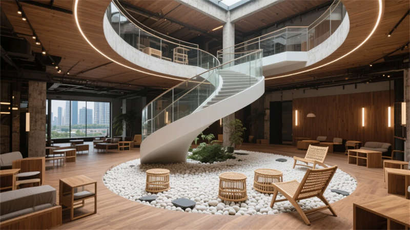 開放式核心區(qū)采用模塊化家具系統(tǒng),配合智能照明與聲學(xué)優(yōu)化,兼顧協(xié)作效率與專注需求;階梯沙龍與透明會議盒子激發(fā)即興創(chuàng)新,可移動隔斷實現(xiàn)場景自由切換。最具特色的是貫穿三層的垂直生態(tài)中庭,旋轉(zhuǎn)樓梯纏繞常綠藤蔓,成為連接空間的活力紐帶。