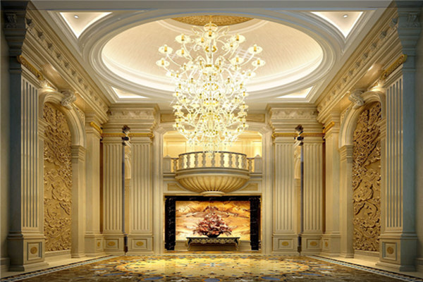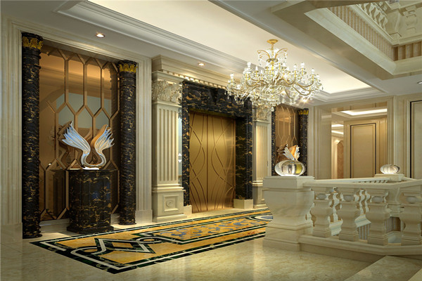 走廊依然是延用水晶燈和羅馬柱,但在裝飾上則搭配金屬雕塑,華麗的外表下透漏著高貴霸氣。