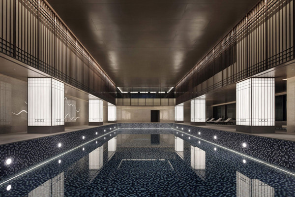 湛藍的泳池乃山水縮影,點、線、面,展現層巒疊嶂的山脈驟然輕盈,山水觸手可及。