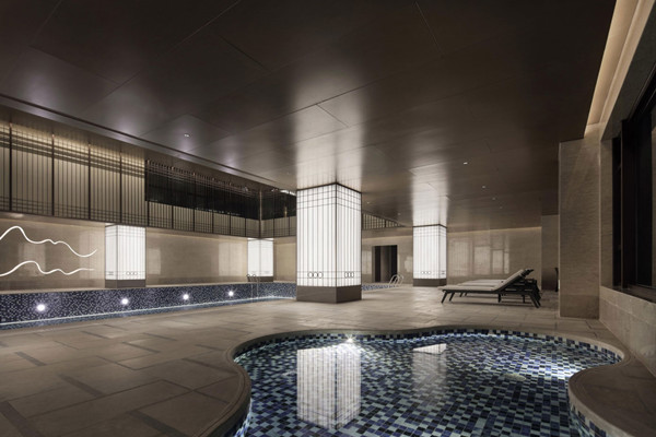 細致的從空間注入圓、點、線,繁縟而有節配上雅致玻璃吊飾,自然光映出流光溢彩,水的意象呈現東方肌理,光影交織突顯五重院落的建筑,彰顯東方大境。