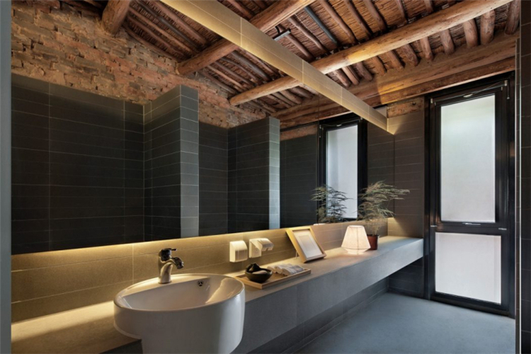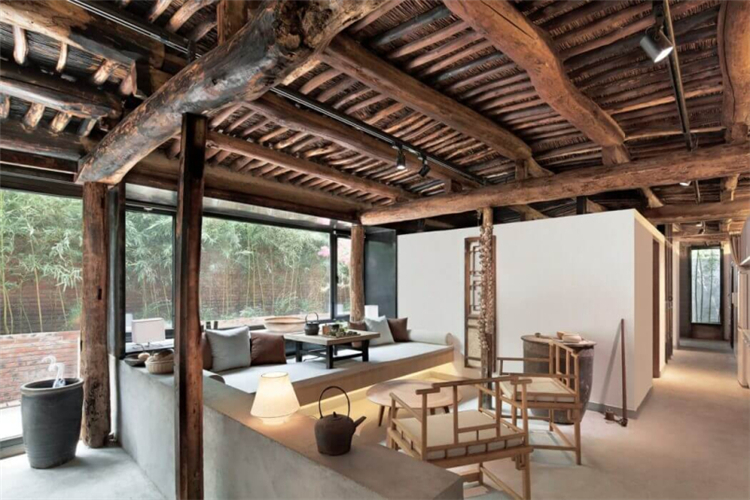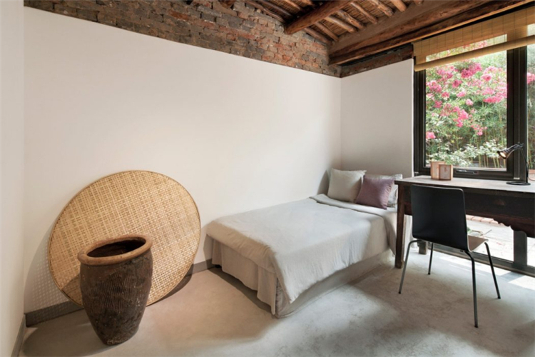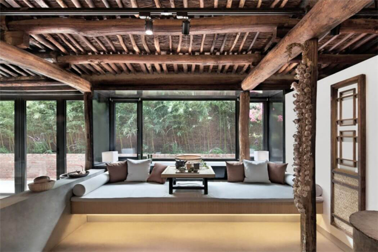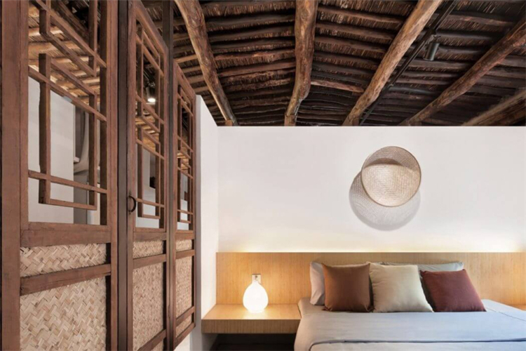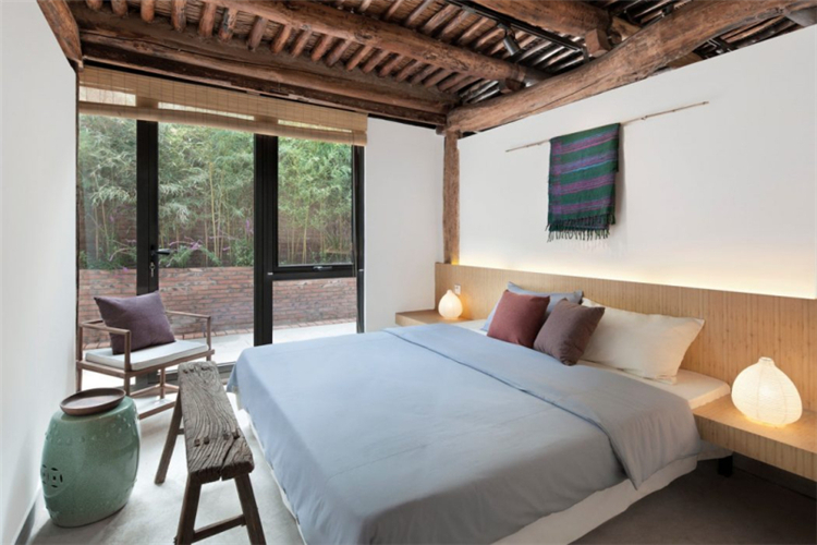 而我們在這次的民宿的功能布局方面,我們根據與居民的詳細溝通,了解他們的日常生活和習慣,進行調整,重新組織平面圖。在我們拆除吊頂后,更多的空間被釋放,原始的木結構和稻草覆蓋的天花板紋理終于顯露出來,講述了一個時間的故事。在現場勘察過程中,我們在建筑物西側和鄰近墻壁之間發現了一條約80厘米寬的狹窄通道。因此,我們在走廊盡頭向西側設計了一個觀景窗。在窗外,擺動的竹影有助于將室內空間與自然環境相連。