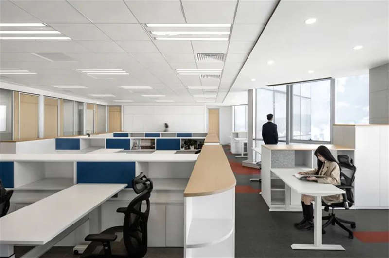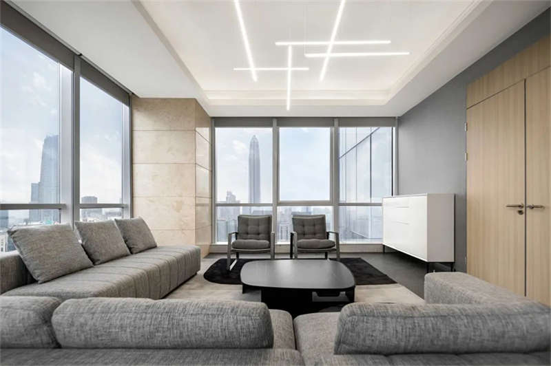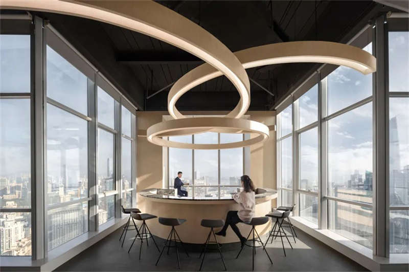 由于原辦公室把獨立辦公室放在靠幕墻一側導致開放辦公區光線不足,在改造過程中設計師把獨立辦公室往核心區域設置,把幕墻一側打開,陽光傾瀉,將城市天際線和內部空間的交互限制解除,讓城市天空與四季變化成為空間的景觀和陳設。
