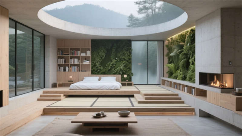 客房以極簡的智慧回應棲居本質。榻榻米地臺消弭床與地面的界限,270°環景霧化玻璃輕觸即透,仿生綠植在智能光影中呼吸生長,隱藏式投影幕布落下時,星空與林海皆成私享背景。階梯書吧的垂直綠植墻下,模塊化沙發隨需求自由組合,全息粒子在空氣中勾勒出流動的藝術,而巖板中島餐廳里,藤編座椅與吊燈矩陣的光暈交織,智能調光天窗讓每一餐都浸染著天光的溫度。