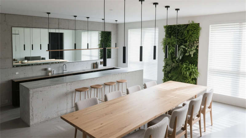 庭院成為生態樞紐,幾何水景倒映建筑體塊,耐旱植物與灰石板構成低維護景觀。多功能廳通過靈活隔斷適應共享需求,藝術品陳列架隨動線旋轉生趣。整體摒棄繁復裝飾,用材質本真觸感、光影時間軌跡與城市山水意境,營造大隱于市的當代棲居范本。