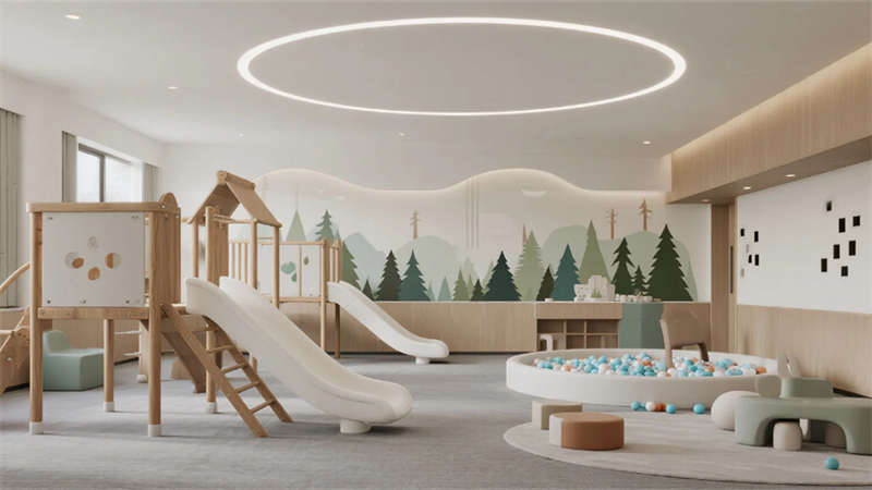 這座親子民宿以現(xiàn)代簡(jiǎn)約美學(xué)為靈魂,將自然元素與童趣設(shè)計(jì)無(wú)縫銜接。空間摒棄繁復(fù)裝飾,選用淺木、純白與低飽和色彩鋪陳,弧形線條與柔和光影交織,營(yíng)造出寧?kù)o而溫暖的氛圍。從大堂的嵌入式動(dòng)物燈箱到套房的樹屋床鋪,每一處細(xì)節(jié)都暗藏親子互動(dòng)巧思,安全圓角家具與軟包地臺(tái)呵護(hù)孩童探索的每一步。