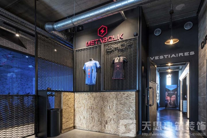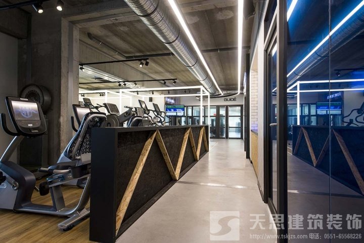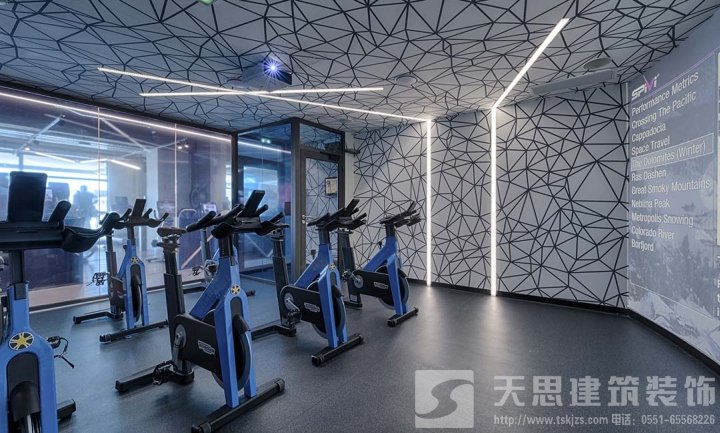 動感單車房的裝修和操房差不多,在風格設計中也要求注意與整個健身房的風格融合統一,不要只追求酷炫感。動感單車是一個特殊項目,具有極強的煽動性,可以即刻提升會員或參觀者的健身欲望,因此一般安排在整個健身房都能注意到的空間里。