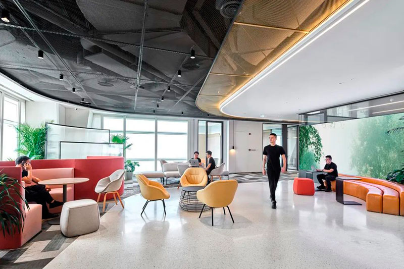 不同于投資公司的傳統(tǒng)形象,設(shè)計師以一個圓島吧臺和開敞的自由交流區(qū)作為前廳接待場所。大量的自然光涌入室內(nèi),明凈開闊。天花地面是圓轉(zhuǎn)流動的曲線造型,采用水磨石地面、金屬網(wǎng)天花、Bolon塑膠地毯等各種新環(huán)保材料,輔以色彩鮮麗的多功能家具組合、大型LED屏和隨處點(diǎn)綴的綠植,呈現(xiàn)出年輕、現(xiàn)代、科技而又充滿能量的生命氣息。