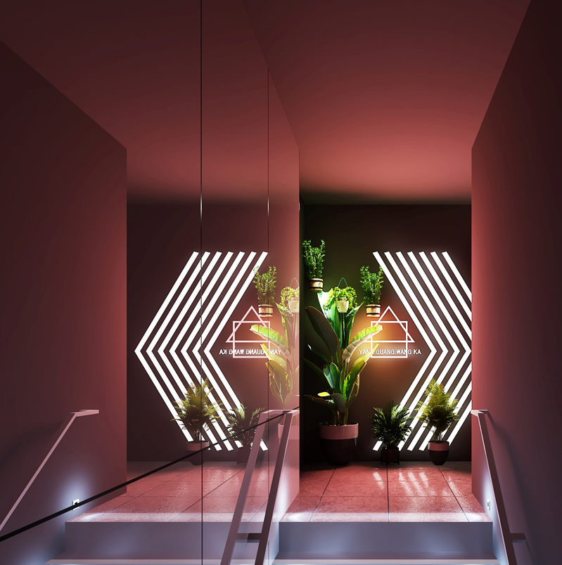 電競氛圍的營造不是單一的,而是無處不在。樓梯入口處醒目而又充滿趣味的燈帶指示標,巧妙的標識著空間的轉角,入門處便有一種電競感。