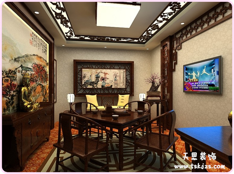 設計思路:以仿清代室內布置為主.用清式家具和窗花、字畫、木欄干等管造古色古香的氛圍。廚衛和孩子房則以現代裝飾手法為主。古為今用、古今結合,創造居空新風貌。
