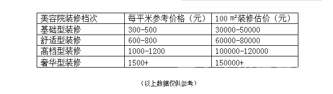 以上是我們根據(jù)當前的市場行情,所制定的一份參考裝修價格表,當然在實際當中,根據(jù)地理位置以及材料選擇,還有裝修風格等各種因素,都會對美容院的裝修價格起到影響,所以美容院裝修要花多少錢還得以實際情況為準。