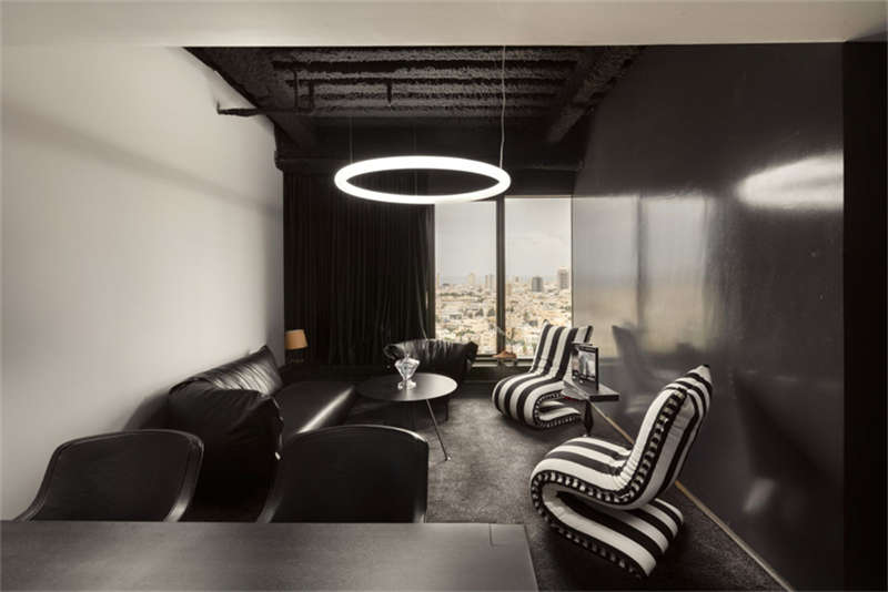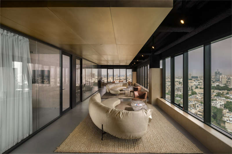 盒子面向“起居室”,這是一個開放空間,有各種座位,一個活躍的酒吧作為辦公室的中心。